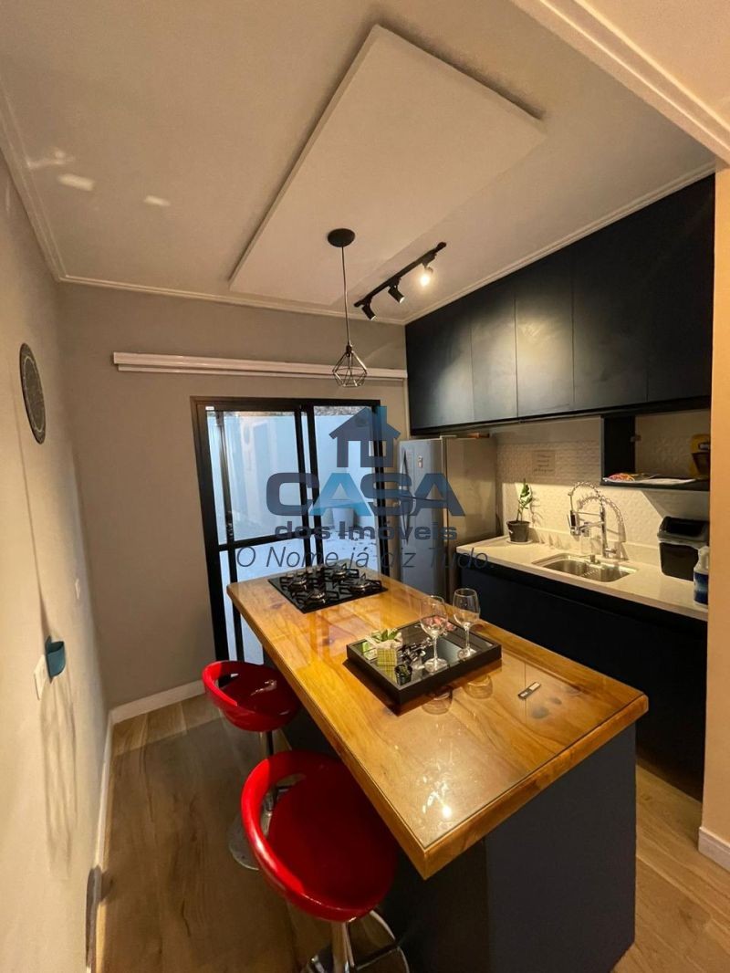 A área social dispõe de sala aconchegante, cozinha com ilha, equipada com cooktop, forno elétrico e armários planejados, além de lavabo, quintal privativo e lavanderia. Possui ainda garagem com 2 vagas.